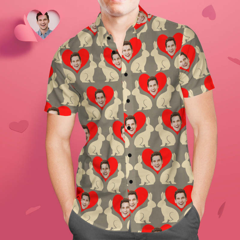 Custom Face Hawaiian Shirt Men's Popular All Over Print Hawaiian Beach Shirt Valentine's Day Gift - Heart and Rabbit