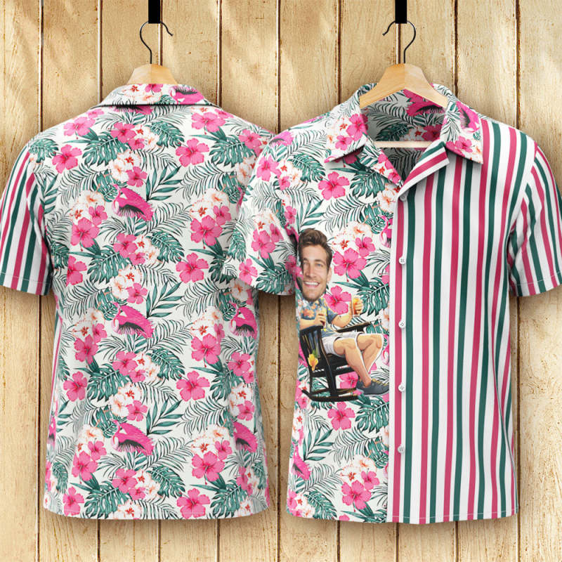 Custom Face Hawaiian Shirt Pink flowers Men's All Over Print Striped Aloha Shirt