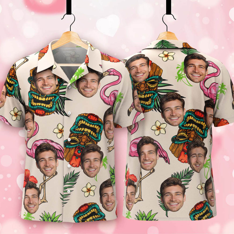 Custom Face Hawaiian Shirt White with Tropical Icons Tiki & Flamingo Fun Personalized Beach Look