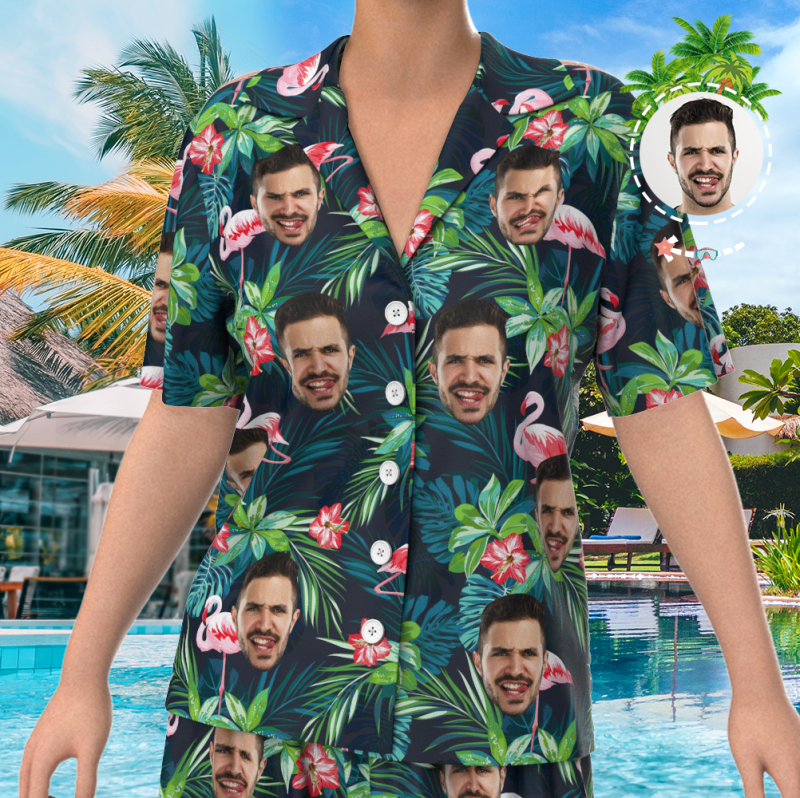Mother's Day Gifts Pyjamas Custom Face On Pajamas, Button-Down Nightwear, Short Sleeve Sleepwear - Leaves & Flamingo