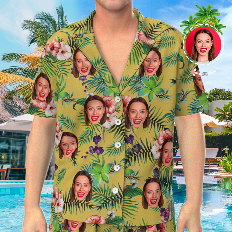 Mother's Day Gifts Pyjamas Custom Face On Pajamas, Button-Down Nightwear, Short Sleeve Sleepwear - Yellow