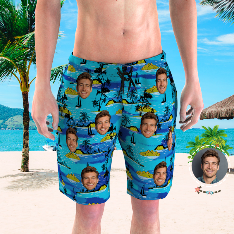 Custom Face Beach Shorts Men's Photo Swim Trunks Gifts for Him - Tropical Island
