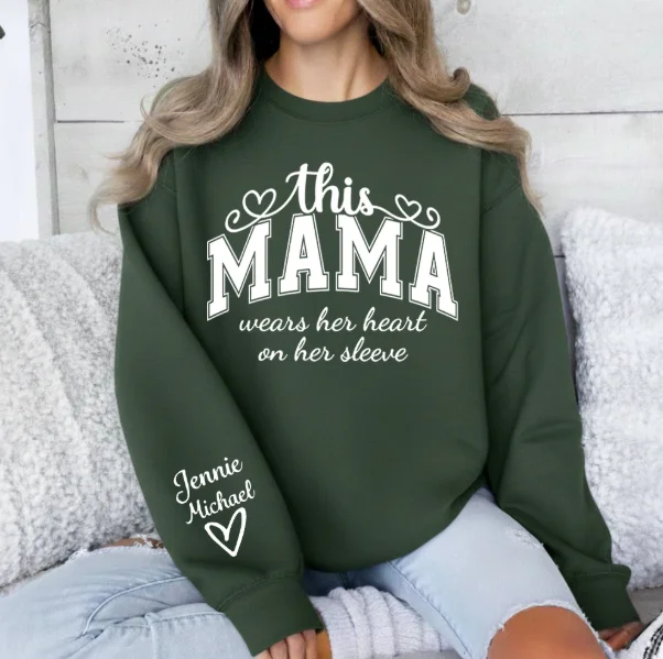 This MAMA Wears Her Heart On Her Sleeve Personalized Sweatshirt, Personalized Valentine Mama Sweatshirt